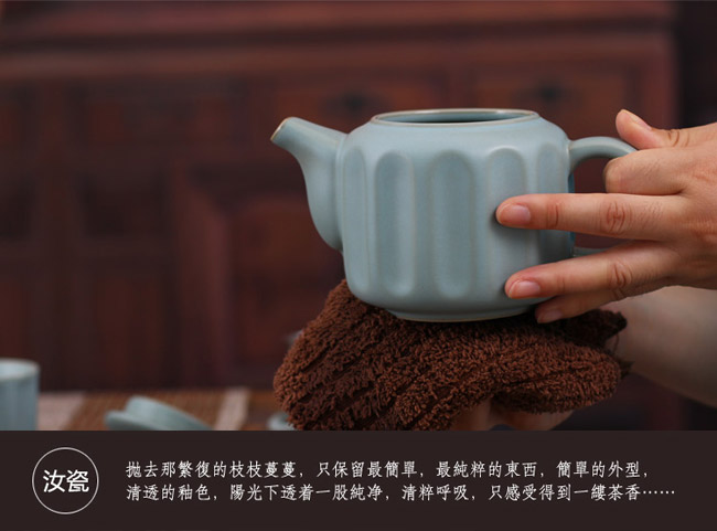閑暇時,尋一處雅致安靜地,看茶色流動,觀蟬翼隱現(xiàn),感汝瓷風(fēng)韻,讓這一抹天青帶你回到那個久遠的年代。拋去那繁復(fù)的枝枝蔓蔓,只保留最簡單,最純粹的東西簡單的外型,清透的釉色,陽光下透著一股純凈、清粹呼吸,只感受那一縷茶香……