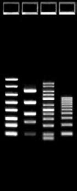 From left to right: FlashGel® DNA Marker 100 bp – 4 kb, FlashGel® QuantLadder, Lonza Marker 50 bp – 2,500 bp, Lonza 100 bp Ladder.
