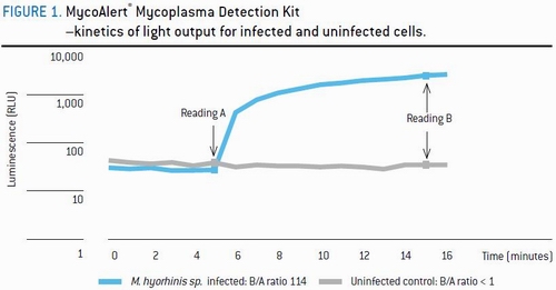 Lonza發(fā)光法—MycoAlert支原體檢測試劑盒 美國Lonza MycoAlert支原體檢測試劑盒是利用支原體酶的這一特定活性,進(jìn)行選擇性的生物化學(xué)檢測。這些酶的存在提供了一種快速的篩選操作,能靈敏地檢測出樣本中的支原體污染。這些存活的支原體被溶解,然后釋放出來的酶與支原體檢測試劑盒中提供的底物發(fā)生催化反應(yīng),將ADP轉(zhuǎn)化成ATP。通過測量樣品中添加底物前后ATP的含量,可以得到一個(gè)比率,該比率指示支原體是否存在。如果這些酶不存在,第二次讀數(shù)相對于第一次讀數(shù)就沒有增加;如果酶與底物進(jìn)行特異性反應(yīng),就會導(dǎo)致ATP含量上升。ATP含量的上升通過生物發(fā)光化學(xué)反應(yīng)可以檢測到,其公式如下: Luciferase ATP + Luciferin + O2 —> Oxyluciferin + AMP Mg 2+ + PPi + CO2 + LIGHT