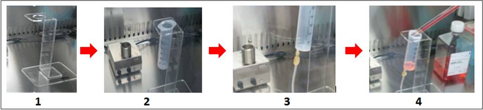 1.將細胞培養(yǎng)袋支架立于操作臺上,確保臺面無尖銳物品。 2.取50m注射器一個,拔出推塞,將注射器套筒插入培養(yǎng)袋支架上的圓孔內(nèi)。 3.將培養(yǎng)袋A端螺口旋下,與注射器套筒連接。 4.加入待培養(yǎng)細胞及培養(yǎng)液。具體步驟如下圖所示: