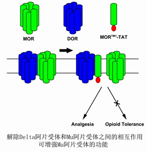 作者通過一系列的實驗發(fā)現(xiàn),阻止μ阿片受體進入δ阿片受體介導的受體降解途徑可以增強μ阿片受體介導的鎮(zhèn)痛效力。在δ阿片受體特異性的激動劑刺激下,位于細胞膜上的δ阿片受體和μ阿片受體共同被內(nèi)吞進入細胞內(nèi),并主要進入溶酶體進行降解。他們還發(fā)現(xiàn)μ阿片受體的第一次跨膜段介導了其與δ阿片受體的結(jié)合,因此設計了將幫助大分子穿膜的TAT肽段連接于μ阿片受體第一次跨膜段C端的干擾蛋白,用于解除脊髓痛覺傳導通路中兩類阿片受體間的相互作用。動物實驗表明,注射該干擾蛋白可以阻礙脊髓內(nèi)的δ阿片受體和μ阿片受體相互作用,不但提高了嗎啡的鎮(zhèn)痛效果,而且降低嗎啡的耐受作用。這些結(jié)果提示,激活δ阿片受體可以造成兩類阿片受體的共同內(nèi)吞和降解,該機制對μ阿片受體的脫敏起著很重要的調(diào)節(jié)作用。該研究結(jié)果為提高阿片類鎮(zhèn)痛劑的鎮(zhèn)痛效果提供了一種新策略。 該工作得到了中國科學院、科技部973項目、國家自然科學基金等項目的資助。 |
