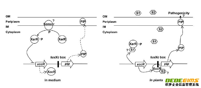 XerR調(diào)控xccR/pip遺傳位點(diǎn)表達(dá)工作模型 群體感應(yīng)(Quorum sensing,QS)是細(xì)菌根據(jù)自身分泌的信號(hào)分子的濃度感應(yīng)細(xì)胞密度進(jìn)而產(chǎn)生細(xì)菌群體行為的基因調(diào)控方式。由信號(hào)分子介導(dǎo)的信號(hào)傳遞途徑不僅發(fā)生在細(xì)菌之間,也存在于真核生物與細(xì)菌之間。 野油菜黃單胞菌(Xanthomonas campestris pv. campestris, Xcc)是導(dǎo)致多種十字花科植物發(fā)生黑腐病的一種模式致病菌。中科院微生物研究所方榮祥院士課題組的研究表明,xccR/pip是Xcc致病相關(guān)的遺傳位點(diǎn)。在寄主植物甘藍(lán)中,Xcc的致病因子PIP(脯氨酸亞氨基肽酶)基因表達(dá)受到上游群體感應(yīng)調(diào)節(jié)因子XccR誘導(dǎo)。 方榮祥院士課題組賈燕濤博士通過最新研究,發(fā)現(xiàn)一個(gè)XccR表達(dá)的抑制子XerR,XerR蛋白能夠直接和xccR啟動(dòng)子探針結(jié)合抑制XccR表達(dá)。有趣的是,在植物體內(nèi),超表達(dá)XerR菌株其xccR的表達(dá)不但沒有降低,xccR和pip的轉(zhuǎn)錄水平反而更接近野生型,說明XerR對(duì)XccR的抑制作用被解除。 課題組人員試圖了解超表達(dá)XerR的菌株是如何解除對(duì)xccR基因表達(dá)的抑制作用,又進(jìn)一步開展了體外結(jié)合實(shí)驗(yàn)。實(shí)驗(yàn)結(jié)果證明:XerR對(duì)xccR/pip表達(dá)的去抑制是由于植物信號(hào)的參與引起的。植物中某種分子量小于1KD的水提取物解離了XerR蛋白和DNA的相互作用,同時(shí),該水提取物還促進(jìn)了XccR與pip啟動(dòng)子DNA序列的結(jié)合效率。 這是第一次有文獻(xiàn)報(bào)道植物病原菌對(duì)植物產(chǎn)生的信號(hào)分子產(chǎn)生感應(yīng),從而成功侵染宿主??蒲腥藛T推測(cè),細(xì)菌在長(zhǎng)期進(jìn)化過程中,形成了一類通過跨界感應(yīng)植物信號(hào)分子的獨(dú)特的群體感應(yīng)信號(hào)轉(zhuǎn)導(dǎo)機(jī)制,適應(yīng)了植物的生存環(huán)境,并最終達(dá)到細(xì)菌致病的目的。 該項(xiàng)目得到了國(guó)家自然科學(xué)基金項(xiàng)目和科技部973項(xiàng)目的支持。相關(guān)論文4月12日在線發(fā)表在《細(xì)胞研究》(Cell Research)上。 |