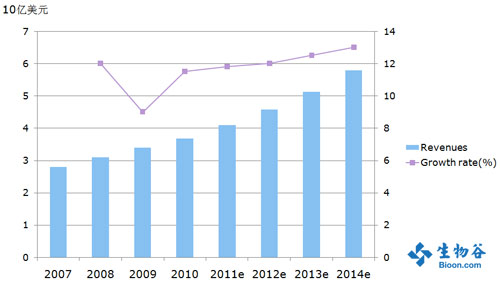全球分子診斷市場現(xiàn)狀分析及預測 2010年,全球體外診斷市場的規(guī)模逾400億美元,中國的體外診斷市場大概為150億人民幣。預計到2014年,全球的體外診斷市場規(guī)??蛇_到500億美元,中國的體外診斷市場達到350億元。目前,全球的體外診斷市場中以美國、歐洲、日本占據(jù)大部分的市場份額,新興市場占據(jù)的份額很小。