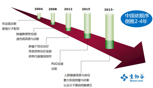 分子診斷是體外診斷中發(fā)展最為迅速的一部分。據(jù)張博士介紹,2009年,分子診斷市場占體外診斷市場的9.6%左右。全球的分子診斷市場發(fā)展速度達到10%以上,中國的分子診斷市場每年的增長速度達到20%以上,增長速度為全球的2倍,分子診斷產業(yè)發(fā)展速度如此之快,帶來了很多的發(fā)展機會。 分子診斷的應用及相關企業(yè) 目前,分子診斷產品主要應用在臨床各科的診斷中,如腫瘤、感染、遺傳等方面,這部分的應用占到了74%。其次應用于各種體檢中心、技術服務中心、第三方檢測機構及微生物的快速檢測市場等方面。 張博士展示了全球MDx市場熱點的時間線,2004年,全球分子診斷市場熱點集中在傳染病診斷、移植分子配型方面,到了2008年,轉移到了腫瘤敏感性檢測、遺傳病篩查與診斷方面。預計到2012年,分子診斷技術將會大范圍的應用到腫瘤個性化治療、昂貴藥物治療監(jiān)測、藥物代謝基因組學等, POC檢測、法醫(yī)、人群健康篩查與體檢、重大疾病預警與診斷、公眾分子基因檔案建立等方面的應用成為未來的發(fā)展趨勢。