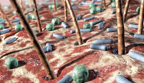 人類皮膚上的細(xì)菌(藍(lán)和綠)的電腦合成圖。人的皮膚上生活著多種細(xì)菌,尤其是汗腺和毛囊附近。有時(shí)它們會(huì)引起感染,形成粉刺。