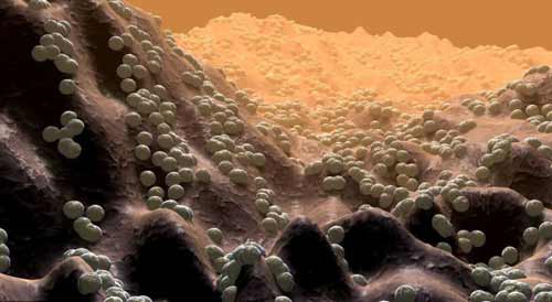 這是放大圖片,它顯示的是位于一個(gè)細(xì)胞表面的大量球菌。球菌是指任何類型的圓形細(xì)菌。每個(gè)球菌就是一個(gè)完整的生命體。