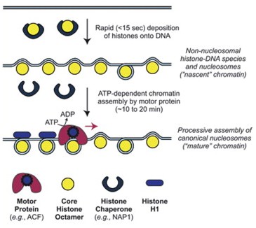 Identification of a Rapidly Formed Nonnucleosomal Histone-DNA Intermediate that Is Converted into Chromatin by ACF Sharon E. Torigoe, Debra L. Urwin, Haruhiko Ishii, Douglas E. Smith, James T. Kadonaga Chromatin assembly involves the combined action of histone chaperones and ATP-dependent motor proteins. Here, we investigate the mechanism of nucleosome assembly with a purified chromatin assembly system containing the histone chaperone NAP1 and the ATP-dependent motor protein ACF. These studies revealed the rapid formation of a stable nonnucleosomal histone-DNA intermediate that is converted into canonical nucleosomes by ACF. The histone-DNA intermediate does not supercoil DNA like a canonical nucleosome, but has a nucleosome-like appearance by atomic force microscopy. This intermediate contains all four core histones, lacks NAP1, and is formed by the initial deposition of histones H3-H4. Conversion of the intermediate into histone H1-containing chromatin results in increased resistance to micrococcal nuclease digestion. These findings suggest that the histone-DNA intermediate corresponds to nascent nucleosome-like structures, such as those observed at DNA replication forks. Related complexes might be formed during other chromatin-directed processes such as transcription, DNA repair, and histone exchange.