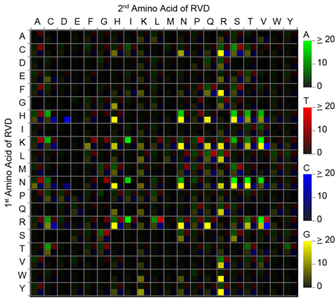 顯示TALE RVDs (Repeat-Variable Diresidues) 識別DNA堿基偏好性的熱圖 TALE (Transcription activator-like effector)是由多種黃單胞菌屬(Xanthomonas)細菌產(chǎn)生的用于激活宿主基因表達的第三類分泌蛋白。 自從2009年science同時發(fā)表了兩篇破譯TALE蛋白特異識別DNA堿基序列密碼的論文之后,TALE 的人工改造成為研究熱點,被迅速用于真核基因的定點修飾中;特別是TALE核酸酶(TALENs)的發(fā)明,使得真核基因的高效定點敲除在多種高等生物中得以實現(xiàn)。 然而,TALE識別DNA的常用密碼來自于25個天然存在的編碼序列,其強度和特異性還存在不足。雖然理論上存在400種可能的編碼情況,但由于人工組裝TALE蛋白序列有較高的技術(shù)難度,人們對其他潛在密碼識別DNA堿基的偏好性仍然一無所知。 魏文勝實驗室利用自主研發(fā)的高效TALE蛋白組裝技術(shù)(ULtiMATE system)以及全新文庫構(gòu)建方法成功建立了涵蓋所有編碼可能性的TALE蛋白評估系統(tǒng),并由此獲得了全部TALE重復單元識別DNA堿基的信息。 研究結(jié)果不僅驗證了已經(jīng)發(fā)表的密碼特性,還增添了DNA序列識別的新成員以及簡并密碼,特別是發(fā)現(xiàn)了能夠更加特異地高效識別鳥嘌呤的新型雙氨基酸密碼。本研究對TALE重復單元識別DNA堿基的規(guī)律認識以及對堿基識別的多樣性拓展,對基因定點修飾技術(shù)在生物工程以及精確制導的基因治療方面具有重要意義。 這項工作已于2月11日在線發(fā)表于《細胞研究》(Complete decoding of TAL effectors for DNA recognition),其共同第一作者為北大生命科學學院魏文勝實驗室的博士研究生楊君嬌和張媛。該項目得到了國家重點基礎(chǔ)研究發(fā)展計劃、國家自然科學基金和北大清華生命科學聯(lián)合中心的支持。