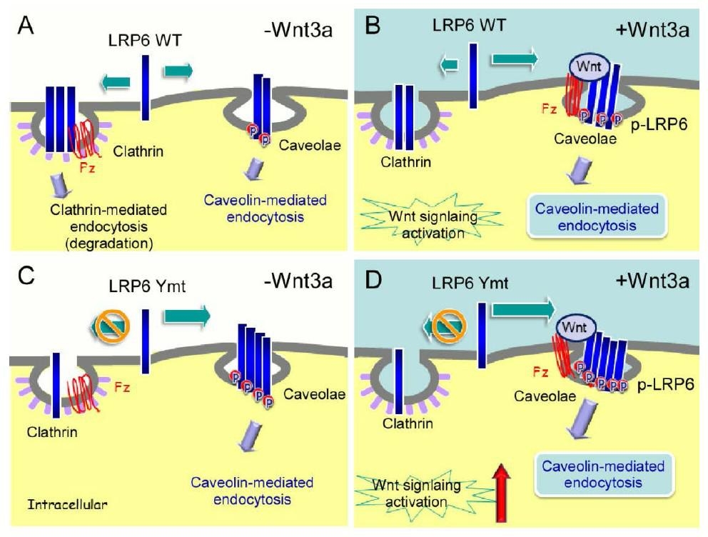 Wnt/β-catenin信號通路在發(fā)育過程中對細胞生長、細胞分化和細胞存活起關(guān)鍵作用。該信號通路失調(diào)將導(dǎo)致各種人類疾病,尤其是癌癥。作為Wnt/β-catenin信號通路的一個重要共同受體,低密度脂蛋白受體相關(guān)蛋白6(LRP6)的內(nèi)吞作用和磷酸化在介導(dǎo)Wnt/β-catenin信號傳導(dǎo)中發(fā)揮了至關(guān)重要的作用。然而,它調(diào)控機制仍不完全清楚。 卜國軍教授課題組的研究成果揭示了LRP6的內(nèi)吞途徑調(diào)節(jié)其磷酸化和Wnt/β-catenin信號強度的分子機制,這也暗示了在人類疾病中該信號通路是如何受到了調(diào)節(jié)。該研究成果也開發(fā)靶向該信號通路的治療手段的發(fā)展也有十分重要的意義。 原文摘要: Tyrosine-based Signal Mediates LRP6 Endocytosis and Desensitization of Wnt/β-catenin Signaling Chia-Chen Liu, Kanekiyo Takahisa, Barbara Roth and Guojun Bu Wnt/β-catenin signaling orchestrates a number of critical events including cell growth, differentiation and cell survival during development. Misregulation of this pathway leads to various human diseases, specifically cancers. Endocytosis and phosphorylation of the LDL receptor-related protein 6 (LRP6), an essential co-receptor for Wnt/β-catenin signaling, play a vital role in mediating Wnt/β-catenin signal transduction. However, its regulatory mechanism is not fully understood. In this study, we define the mechanisms by which LRP6 endocytic trafficking regulates Wnt/β-catenin signaling activation. We show that LRP6 mutant with defective tyrosine-based signal in its cytoplasmic tail has an increased cell surface distribution and decreased endocytosis rate. These changes in LRP6 endocytosis coincide with an increased distribution to caveolae, increased phosphorylation, and enhanced Wnt/β-catenin signaling. We further demonstrate that treatment of Wnt3a ligands or blocking the clathrin-mediated endocytosis of LRP6 lead to a redistribution of wild-type receptor to lipid rafts. The LRP6 tyrosine mutant also exhibited an increase in signaling activation in response to Wnt3a stimulation compared to wild-type LRP6, and this activation is suppressed when caveolae-mediated endocytosis is blocked. Our results reveal molecular mechanisms by which LRP6 endocytosis routes regulate its phosphorylation and the strength of Wnt/β-catenin signaling, and have implications on how this pathway can be modulated in human diseases. |