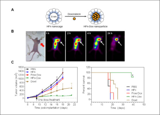 圖1:鐵蛋白納米載體靶向輸送抗癌藥物(A)鐵蛋白納米載體裝載抗癌藥物;(B)攜帶抗癌藥物的鐵蛋白納米粒精確靶向腫瘤;(C)裝載抗癌藥物的鐵蛋白納米粒有效治療結(jié)腸癌,延長生存期。 化療是當(dāng)前癌癥病人首選的治療方式,然而化療中存在的主要問題是毒副作用大。如何提高藥物的療效、降低其副作用,一直是腫瘤藥物研究的關(guān)鍵和難題。隨著納米科學(xué)的蓬勃發(fā)展,利用納米技術(shù)改良藥物的性狀,使其精準(zhǔn)地殺傷腫瘤細(xì)胞,減少對正常組織的損傷,是腫瘤靶向治療的核心。為了獲得具有主動靶向功能的藥物載體,人們通常在納米材料的表面修飾一些功能基團(tuán),如特異識別腫瘤的抗體等。然而,修飾過程不僅復(fù)雜、成本高、而且修飾后的載體分子容易聚集,造成產(chǎn)品不均一。另外,納米材料的生物相容性差也是引起免疫系統(tǒng)識別和清除的重要原因。 閻錫蘊(yùn)課題組依據(jù)人體天然鐵蛋白獨(dú)特的殼核結(jié)構(gòu),仿生合成了24 聚體鐵蛋白納米粒子,其外殼直徑12nm,內(nèi)腔為8nm能有效裝載化療藥物阿霉素。鐵蛋白納米載體有3個突出的特點(diǎn):(1)由人體天然蛋白質(zhì)自組裝而成的藥物載體;(2)無需在其表面做任何修飾,即可直接識別并殺傷腫瘤;(2)動物實(shí)驗(yàn)結(jié)果表明,單劑量給藥就能有效抑制結(jié)腸癌、乳腺癌及黑色素瘤的生長。與目前國際上唯一應(yīng)用于臨床的脂質(zhì)體阿霉素納米藥物相比,療效更好、存活率長而且毒副作用小。 這種新型藥物載體不僅能夠在腫瘤組織富集,而且還使腫瘤細(xì)胞內(nèi)的藥物濃度提高十倍,使阿霉素所致的心臟毒性降低七倍。進(jìn)一步機(jī)制研究發(fā)現(xiàn),鐵蛋白載體結(jié)合腫瘤細(xì)胞膜上的轉(zhuǎn)鐵蛋白受體,是其靶向腫瘤的分子基礎(chǔ)。另外,鐵蛋白納米粒子作為天然蛋白質(zhì),生物相容性好,不易引起機(jī)體的免疫排斥反應(yīng),因此毒性小。本文為天然蛋白納米粒作為高效低毒的靶向載體的研究提供了新思路。 原文摘要: H-ferritin–nanocaged doxorubicin nanoparticles specifically target and kill tumors with a single-dose injection Minmin Liang, Kelong Fan, Meng Zhou, Demin Duan, Jiyan Zheng, Dongling Yang, Jing Feng and Xiyun Yan An ideal nanocarrier for efficient drug delivery must be able to target specific cells and carry high doses of therapeutic drugs and should also exhibit optimized physicochemical properties and biocompatibility. However, it is a tremendous challenge to engineer all of the above characteristics into a single carrier particle. Here, we show that natural H-ferritin (HFn) nanocages can carry high doses of doxorubicin (Dox) for tumor-specific targeting and killing without any targeting ligand functionalization or property modulation. Dox-loaded HFn (HFn-Dox) specifically bound and subsequently internalized into tumor cells via interaction with overexpressed transferrin receptor 1 and released Dox in the lysosomes. In vivo in the mouse, HFn-Dox exhibited more than 10-fold higher intratumoral drug concentration than free Dox and significantly inhibited tumor growth after a single-dose injection. Importantly, HFn-Dox displayed an excellent safety profile that significantly reduced healthy organ drug exposure and improved the maximum tolerated dose by fourfold compared with free Dox. Moreover, because the HFn nanocarrier has well-defined morphology and does not need any ligand modification or property modulation it can be easily produced with high purity and yield, which are requirements for drugs used in clinical trials. Thus, these unique properties make the HFn nanocage an ideal vehicle for efficient anticancer drug delivery.