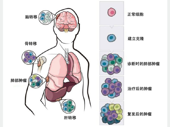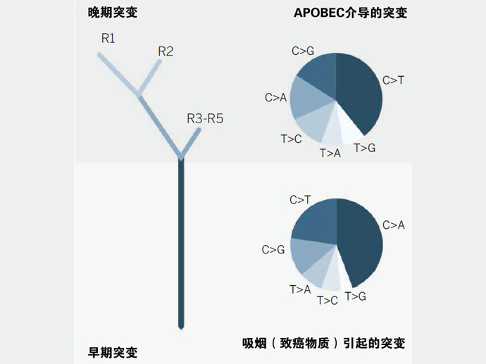 肺癌復發(fā)。該模型演示了腫瘤如何不斷獲得更加合適的克隆,產生亞克隆以及最終出現(xiàn)腫瘤異質性的過程。 為何肺癌如此容易復發(fā)? 大約40年前,研究者就預測每位癌癥患者都需要得到個體化的治療,即使這樣,還是有些負隅抵抗的癌細胞會卷土重來。如今,在多種惡性腫瘤中,我們都不得不懷著沉重的心情接受這一預測的正確性?,F(xiàn)在,已經有研究證實,惡性細胞克隆及亞克隆的演化進展不僅僅通過逐漸獲得突變的方式,同時也和突然發(fā)生的災難性事件(例如大量染色體重組)有關,這些都會導致腫瘤組織內的基因組異質性的出現(xiàn)。新一代測序技術的出現(xiàn),讓研究者可以對這些生物學過程進行前所未有的細致研究。在血液性惡性腫瘤、乳腺癌、卵巢癌、膀胱癌、胰腺癌和腎癌中都發(fā)現(xiàn)了大量的腫瘤內異質性現(xiàn)象。最近,Zhang及de Bruin等人帶領的研究小組都有了新的研究發(fā)現(xiàn),分別在自己的研究中發(fā)現(xiàn)了肺癌中普遍存在的腫瘤內異質性,為今后的研究奠定了重要基礎。 肺癌是全世界最常見的癌癥相關導致的死亡原因之一。其中,非小細胞肺癌(NSCLC)是最常見的分型,大約占新診斷肺癌病例中的85%。根據所在地區(qū)的不同,有10%-40%的NSCLC患者沒有吸煙史,多于一半的患者在診斷出肺癌數年前就已經戒煙。大部分NSCLC患者在確診時,不是已經發(fā)生轉移,就是在接受針對原發(fā)癌癥所進行的治療時,出現(xiàn)復發(fā),這一現(xiàn)象也說明了對該疾病進行系統(tǒng)化研究的重要性。在過去數十年里所研發(fā)使用的細胞毒性的化療方法,最終證明只能對轉移性NSCLC患者的生存率有非常一般的提高。然而,有一小部分患者(15%),腫瘤發(fā)生與編碼表皮生長因子受體(EGFR)的基因發(fā)生突變有關,或者與編碼間變性淋巴瘤激酶(ALK)基因突變有關,在接受特異靶向性治療后,表現(xiàn)出顯著的療效。盡管這些患者在確診數年后,最終也會出現(xiàn)腫瘤的惡性進展。全面闡明導致肺癌起始、維持、進展過程中的分子事件,對于找到提高患者預后的治療方法至關重要。 NSCLC發(fā)病與吸煙史之間的關系十分復雜,從基因組序列分析上,可以找到大量相關的單點突變、基因擴增、插入、刪除及結構重組。相反,從非吸煙的肺癌患者所獲得的組織樣品的研究來看,所具有的突變及基因組改變就少得多。到目前為止,幾乎所有針對肺癌的基因組研究所使用的樣本,都是來自腫瘤組織的單個區(qū)域,這無疑限制了對腫瘤內異質性及克隆演變的了解。 腫瘤的演變可以通過線性方式,也就是逐漸獲得更加合適的克隆,最終超過現(xiàn)有克隆的速度;或者采取更加常見的分支演進方式:多個亞克隆同時存在并進展,最終獲得異質性高度復雜的腫瘤組織。鑒別突變產生的關鍵“驅動者”——也就是使癌細胞具有選擇性生長優(yōu)勢的突變——在NSCLC致病中的分支點,對于尋找有效的治療方法十分重要。Zhang等人采用多區(qū)域全外顯子測序技術,對11個肺腺癌樣本進行了檢測;de Bruin也使用相同的全外顯子測序手段以及/或者全基因組測序,對7個NSCLC原位腫瘤樣本中25個空間上彼此相隔的區(qū)域進行了檢測。在所有18個原位腫瘤中,腫瘤內異質性普遍存在。由de Bruin所進行的檢測中,大約有三分之一的非沉默突變出現(xiàn)在上述25個區(qū)域中的至少一個中,但并未出現(xiàn)在所有區(qū)域。De Bruin等人的研究結果表明,在亞克隆多樣化出現(xiàn)之前、甚至之后所出現(xiàn)的關鍵突變驅動的分支進化,有可能帶來一個我們十分不愿意看到的可能性:如果按照目前臨床上理性的做法,對腫瘤組織單個區(qū)域取樣,很有可能會漏檢在特定亞克隆內已經出現(xiàn)的突變。與之對應,Zhang等人從所有腫瘤樣本區(qū)域內21個已知癌基因中鑒定出了20個。由于這兩個研究的樣本量都太小,因此無法據此得到最終的結論,因此,在目前階段,臨床上單個區(qū)域活檢的方式也還會繼續(xù)下去。盡管對高風險的轉移性病變進行多區(qū)域、多位點的活檢有利于檢出突變,但還需要信服力更強的研究結果來支持,從而從根本上改變目前的例行做法。 克隆演化。該圖中的系統(tǒng)發(fā)生樹為我們展示了肺癌的克隆演化過程。餅圖顯示了發(fā)生于腫瘤進化早期(吸煙誘導的突變)和晚期進化(APOBEC介導的)的6種類型的突變。R表示腫瘤的區(qū)域。 研究者還需要進行更多的工作,以便闡明由突變驅動的區(qū)域性占優(yōu)勢的亞克隆的比率,以及其在腫瘤轉移和藥物抗性上的作用。Zhang等人發(fā)現(xiàn)其中有三名攜帶大量亞克隆的患者在手術后出現(xiàn)復發(fā),這一發(fā)現(xiàn)需要得到進一步的關注,已確定是否可以采用腫瘤內異質性自身作為預后較差的生物標記。 De Bruin等人的兩個有趣發(fā)現(xiàn)表明了,與吸煙相關的基因組事件發(fā)生于疾病很早的階段,與之相伴的還包括突變驅動性因子以及單核苷酸突變。與吸煙相關的基因組加倍等事件早在曾經有吸煙史的患者臨床疾病出現(xiàn)很久以前就已經發(fā)生,說明了第一組驅動性因子出現(xiàn)后,會有一個持久的潛伏期,然后才會出現(xiàn)臨床癥狀。即使持續(xù)吸煙,致癌物質相關的基因組事件會隨著時間而減少,同時伴有與一系列相關酶類活化相關的突變的增加,這類酶叫做載脂蛋白B mRNA剪接