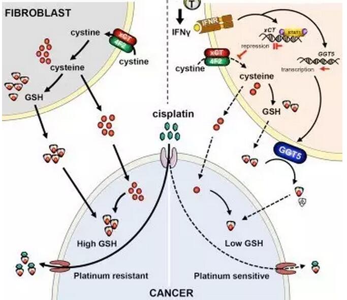 在這項最新研究中,研究人員發(fā)現(xiàn)成纖維細胞能夠減少鉑在卵巢癌細胞核內(nèi)的積累,成為癌細胞抵抗鉑類化療藥物的重要原因。與此同時他們還發(fā)現(xiàn)成纖維細胞釋放的谷胱甘肽和半胱氨酸促進了癌細胞對化療藥物的抵抗。