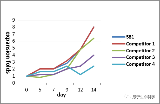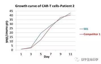 隨后研究人員比較了581與Competitor1在普通未接受放、化療B-ALL病人樣本中,CAR-T細胞的擴增情況。用同樣的分離、刺激和培養(yǎng)方法擴增11天,581體系中CAR-T細胞擴增42.8倍,高于Competitor1的40.5倍,生長曲線顯示581具有推遲的對數(shù)生長期和更高的擴增潛能(Figure2,由于回輸?shù)男枰?,細胞未繼續(xù)擴增)。在其他B-ALL病人和健康人樣本中,研究人員也獲得了相似的結果。