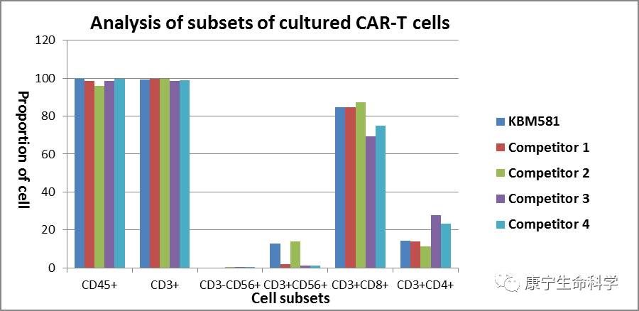 研究人員首先對比了包括KBM581在內的不同品牌的5種無血清培養(yǎng)基在化療病人血液樣本制備CAR-T細胞中的效果。B-ALL病人在采血前不久接受了化療,分離到PBMC后,用T細胞分選試劑盒進行T細胞分選,然后用CD3/CD28磁珠活化,同時加入IL-2進行細胞培養(yǎng);培養(yǎng)第3天,用連接有CD19-CAR基因的慢病毒載體轉導細胞,繼續(xù)培養(yǎng)到第14天。與其它商品化的淋巴細胞培養(yǎng)基相比,581和另一品牌產(chǎn)品Competitor1(Competitor1和Competitor2都被認為是最經(jīng)典的淋巴細胞培養(yǎng)基)獲得了最高的擴增效率(8倍,Figure1a)。細胞表型檢測結果顯示581和Competitor1的T細胞純度、CTL比例都符合該實驗室要求。CD8+的CTL比例都超過80%,提示較高的殺傷活性。