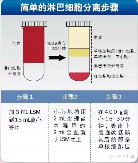 人外周血中各種細(xì)胞的密度不同,人紅細(xì)胞密度為1.093g/mL,粒細(xì)胞為1.092g/mL,淋巴細(xì)胞為1.074±0.001g/mL。密度梯度離心法的原理主要根據(jù)各類血細(xì)胞比重的差異,使一定比重的血細(xì)胞依相應(yīng)的密度梯度分布于不同的獨(dú)立帶,從而達(dá)到分離的目的。 在離心管中,將經(jīng)過生理鹽水稀釋過的全血加在LSM淋巴細(xì)胞分離液之上,經(jīng)過30min,400g的離心后將會(huì)出現(xiàn)四個(gè)分層,分別為血漿層、單核細(xì)胞層(淋巴細(xì)胞、單核細(xì)胞、血小板)、淋巴細(xì)胞分離液層、紅細(xì)胞和粒細(xì)胞層。如下圖所示: 1. 直接使用,無需配置,一步分離。 2. 單個(gè)核細(xì)胞得率高,2ml的血能分出2E7單核細(xì)胞。 3. 低內(nèi)毒素含量 <0.064 EU/mL。 4. 分離條帶清晰,紅細(xì)胞不破損。 5. 分離后細(xì)胞純度>97%,活性>98%。