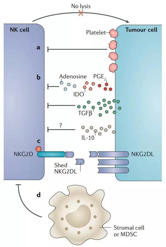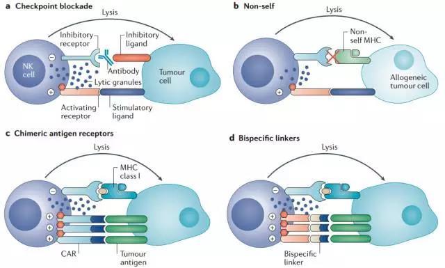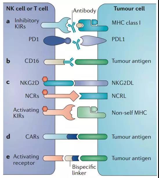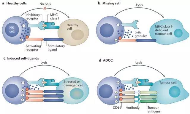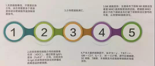NK細(xì)胞又稱自然殺傷細(xì)胞(natural killer cell,NK細(xì)胞),是機(jī)體內(nèi)重要的免疫細(xì)胞,NK細(xì)胞形態(tài)上屬于大顆粒淋巴細(xì)胞,來源于骨髓,是除T細(xì)胞、B細(xì)胞之外的第三大類淋巴細(xì)胞,約占血液中所有免疫細(xì)胞(白細(xì)胞數(shù)量)的15%,屬于天然免疫系統(tǒng)的核心細(xì)胞,主要分布于外周血、肝臟和脾臟,在人體內(nèi)NK細(xì)胞主要特征為CD3-CD56+淋巴細(xì)胞群,其中血液中主要為CD16+CD56dim亞型(根據(jù)細(xì)胞上CD56分子表達(dá)密度的差異,將NK細(xì)胞分為CD56dim和CD56bright兩個亞群;CD56dim占NK細(xì)胞90%以上,主要為細(xì)胞毒作用,表達(dá)中度親和力的IL-2受體(IL-2R),具有更強(qiáng)的殺傷活性;CD56bright可產(chǎn)生大量細(xì)胞因子,主要起免疫調(diào)節(jié)作用,高表達(dá)IL-2R)。 NK細(xì)胞是體內(nèi)負(fù)責(zé)殺傷老化、受病毒感染、腫瘤等異常細(xì)胞的最主要“戰(zhàn)士”。NK細(xì)胞與人體其他150多種白細(xì)胞都不同,它不需要接受免疫系統(tǒng)的特殊指令,也不需要其他細(xì)胞的配合,自己單獨就能識別和攻擊外來細(xì)胞、癌細(xì)胞和病毒。循環(huán)的NK細(xì)胞通常處于休眠狀態(tài),一旦被激活,它們會滲透到組織中,分泌穿孔素及腫瘤壞死因子,攻擊腫瘤細(xì)胞和病毒感染細(xì)胞 NK細(xì)胞是人體抵抗癌細(xì)胞和病毒感染的第一道防線,可非特異性直接殺傷腫瘤細(xì)胞,這種天然殺傷活性既不需要抗原致敏,也不需要抗體參與,且無MHC限制。除了具有強(qiáng)大的殺傷功能外,還具有很強(qiáng)的免疫調(diào)節(jié)功能,與機(jī)體其他多種免疫細(xì)胞相互作用,調(diào)節(jié)機(jī)體的免疫狀態(tài)和免疫功能。臨床研究發(fā)現(xiàn)NK細(xì)胞過繼免疫治療惡性腫瘤具有良好的應(yīng)用前景,對多種實體瘤和血液系統(tǒng)惡性腫瘤均有一定效果。 相關(guān)詞匯: 過繼免疫療法(adoptive immunotherapy)是取對腫瘤有免疫力的供者淋巴細(xì)胞轉(zhuǎn)輸給腫瘤者,或取患者自身的免疫細(xì)胞在體外活化、增殖后,再轉(zhuǎn)輸入患者體內(nèi),使其在患者體內(nèi)發(fā)揮腫瘤作用。 T細(xì)胞受體(TCR)在識別APC細(xì)胞或者靶細(xì)胞上的MHC分子所提呈的抗原肽時,不僅識別抗原肽,還要識別與抗原肽結(jié)合的MHC分子類型,此現(xiàn)象即MHC限制性(MHC restriction)。 注:APC細(xì)胞是抗原提呈細(xì)胞指T細(xì)胞在識別Ag遞呈細(xì)胞傳遞的抗原信息時,必須先識別遞呈細(xì)胞上的MHC抗原類型,如TH細(xì)胞識別MHC-Ⅱ類抗原,而TC細(xì)胞只識別MHC-Ⅰ類抗原,之后才獲取抗原信息的現(xiàn)象。 NK細(xì)胞識別自我與非我并不需要體細(xì)胞基因重排產(chǎn)生識別不同抗原的克隆,而是表達(dá)多種受體執(zhí)行功能。 NK細(xì)胞受體主要包括免疫球蛋白超家族(如KIR),C型凝集素家族如NKG2受體,天然細(xì)胞毒性受體(NCR):NKp46、NKp44和NKp30,下表例舉主要的受體及其調(diào)節(jié)功能: NK可釋放穿孔素、顆粒酶,穿孔素在靶細(xì)胞表面穿孔,使顆粒酶b進(jìn)入靶細(xì)胞誘導(dǎo)靶細(xì)胞凋亡。同時分泌大量的細(xì)胞因子,如ifn-v、tnf-x、gm-csf、il-3、m-csf等,直接作用于靶細(xì)胞,或通過進(jìn)一步激活其他種類免疫細(xì)胞攻擊靶細(xì)胞。并可表達(dá)可以誘導(dǎo)細(xì)胞凋亡的蛋白(fasl)和腫瘤壞死因子相關(guān)凋亡誘導(dǎo)配體(trail),使靶細(xì)胞進(jìn)入程序性凋亡狀態(tài)。 NK細(xì)胞治療流程 NK細(xì)胞的“動態(tài)平衡”狀態(tài)受細(xì)胞表面多種受體蛋白的調(diào)控,簡言之,分為2類:殺傷細(xì)胞活化受體(KAR)和殺傷細(xì)胞抑制受體(KIR)。 圖a. 正常情況下,KAR與自身細(xì)胞上多糖類抗原結(jié)合產(chǎn)生活化信號,同時KIR與MHC I類分子結(jié)合,產(chǎn)生抑制信號且占主導(dǎo)地位,以保證自身組織細(xì)胞不被破壞,阻止NK對自身健康細(xì)胞的殺傷。 圖b. 當(dāng)細(xì)胞表面MHC I類分子發(fā)生改變或減少缺失(腫瘤細(xì)胞或其他損傷的細(xì)胞為逃逸獲得性免疫追殺而下調(diào)MHC消除抑制信號),影響與KIR結(jié)合,不能產(chǎn)生抑制性信號,NK則活化,釋放溶解性顆粒產(chǎn)生殺傷效應(yīng)(MHC I丟失自我) 。 圖c. 即使存在抑制信號,腫瘤細(xì)胞亦可通過過表達(dá)表面抗原與KAR結(jié)合,腫瘤細(xì)胞可以通過激活NK細(xì)胞受體來表達(dá)被誘導(dǎo)的應(yīng)激配體,此時活化信號超過抑制信號,繼而激活NK細(xì)胞殺傷靶細(xì)胞。 圖d. NK細(xì)胞還表達(dá)IgG1和IgG3的低親和力受體FcγRIII(CD16),可與腫瘤抗原特異性抗體Fc段結(jié)合,介導(dǎo)NK細(xì)胞識別并殺傷被抗體包被的腫瘤細(xì)胞,亦稱為抗體依賴性細(xì)胞介導(dǎo)的細(xì)胞毒作用(antibody dependentcell-mediated cytotoxicity, ADCC),ADCC也是NK細(xì)胞殺傷靶細(xì)胞的主要方式。 目前認(rèn)為NK細(xì)胞主要通過以下途徑發(fā)揮殺傷作用: 1.NK細(xì)胞直接通過胞吐作用釋放穿孔素和顆粒酶等細(xì)胞毒性顆粒,活化半胱天冬酶(caspase)途徑誘導(dǎo)靶細(xì)胞凋亡; 2.活化NK細(xì)胞表達(dá)Fas(CD95)配體和TRAIL(TNF related apoptosis inducing ligand,腫瘤壞死因子相關(guān)誘導(dǎo)凋亡配體)分子,誘導(dǎo)CD95+靶細(xì)胞和TRAIL受體陽性的靶細(xì)胞通過內(nèi)源酶的級聯(lián)反應(yīng)發(fā)生凋亡; 3.細(xì)胞因子介導(dǎo)的殺傷作用,NK