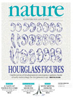 相關(guān)物種中胚胎的出現(xiàn)在發(fā)育過程中途發(fā)生融合,之后又分開,這個現(xiàn)象被稱為“發(fā)育沙漏”。沙漏模型由Karl Ernst von Baer建立在經(jīng)典觀察結(jié)果之上,后來由Ernst Haeckel(達爾文在德國的支持者)廣泛普及。但這種所謂的系統(tǒng)發(fā)生階段是否真的存在?兩個研究小組利用對比方法對這個模型進行了驗證,并為其提供了支持。在該系統(tǒng)發(fā)生階段所表達的基因在演化上比在其他階段所表達的基因更古老、更保守。本期封面為Haeckel在1879年根據(jù)果蠅胚胎形成過程中的表達模式的數(shù)千幅圖像畫出的一幅圖。