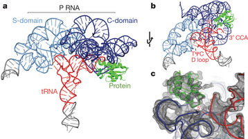 轉(zhuǎn)移RNA(tRNA)是作為前體合成的,這些前體要求在5? 和3?端進(jìn)修剪并對(duì)特定核苷酸進(jìn)行一些修飾。Ribozyme RNase P普遍對(duì)處理tRNA的5?端負(fù)責(zé)。現(xiàn)在,與成熟苯基丙氨酸轉(zhuǎn)移RNA 結(jié)合在一起的RNase P(來自Thermotoga maritima)的晶體結(jié)構(gòu)已被確定。該結(jié)構(gòu)顯示了在pre-tRNA識(shí)別中所涉及的相互作用、活性點(diǎn)位置及催化中金屬的作用。RNase P/tRNA核糖核蛋白結(jié)構(gòu)也為一個(gè)基于RNA的古老世界是怎樣演化為當(dāng)今由蛋白-催化劑支配的世界的提供了線索。