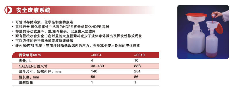 除了這些需要注意的事項以外,處理廢液等污染也需要一些安全可靠的產(chǎn)品,目前國際上公認(rèn)的安全廢液處理,回收等方面的產(chǎn)品來自賽默飛世兒公司,這在之前[駐外觀察員特稿]美國與加拿大生物實驗室廢棄物處置 文中也可以看出來。這些廢液處理小器具包括: