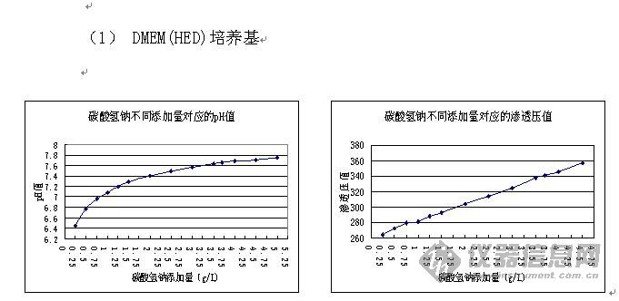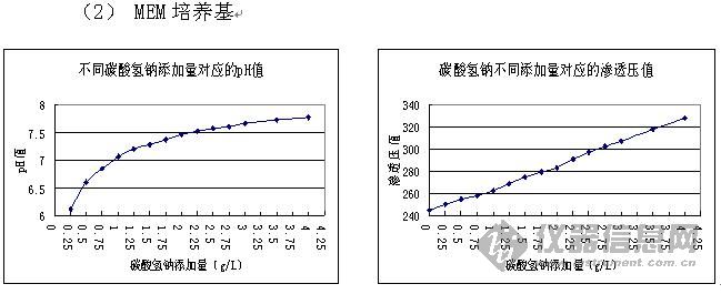 酚紅在培養(yǎng)基中被用來作為pH值的指示劑,研究表明,酚紅可以模擬固醇類激素的作用(特別是雌激素),為避免固醇類反應(yīng),用無酚紅培養(yǎng)基。 5. 在新鮮培養(yǎng)基中添加了血清和抗生素后,有效期是多長? 一旦您在新鮮培養(yǎng)基中添加了血清和抗生素時,您應(yīng)該在兩到三周內(nèi)使用它。因為一些抗生素和血清中的基本成分在解凍后就開始降解。 6. 為什么不要用碳酸氫鈉調(diào)pH值? 如圖所示,培養(yǎng)基pH值隨著碳酸氫鈉量的增加,呈拋物線增長,當(dāng)碳酸氫鈉加到一定量時,pH變化越來越小。而培養(yǎng)基的滲透壓值隨著碳酸氫鈉量的增加,呈直線增長,碳酸氫鈉量越大,滲透壓值越大。 如果為了達(dá)到工作pH值僅加入少量的碳酸氫鈉,而忽略滲透壓,一來可能會達(dá)不到緩沖效果而引起細(xì)胞培養(yǎng)過程中pH值變化較劇烈,二來會使培養(yǎng)基成為低滲溶液,在培養(yǎng)細(xì)胞時易造成細(xì)胞膨脹破裂;如果為了達(dá)到工作pH值而加入大量碳酸氫鈉,一來可能會難以達(dá)到期望的pH值,二來會使培養(yǎng)基成為高滲溶液,在培養(yǎng)細(xì)胞時易造成細(xì)胞萎縮。 生產(chǎn)中最好通過實驗找到合適滲透壓和pH值情況下的碳酸氫鈉加入量。下面是DMEM(HED)和MEM培養(yǎng)基的碳酸氫鈉與pH值、滲透壓的曲線。 ![]() ![]() 7. 細(xì)胞生長質(zhì)量很好,為什么病毒、蛋白表達(dá)量沒有提高?