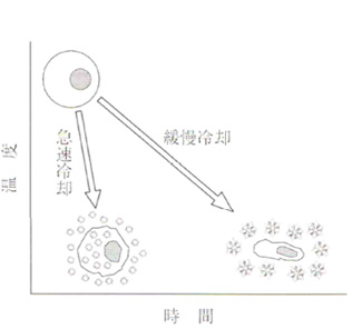 上世紀(jì)50-70年代Basil Luyet,James Lovelock,Peter Mazur等學(xué)者針對(duì)冷凍對(duì)細(xì)胞和組織的影響展開深入研究,發(fā)現(xiàn)損傷主要來源于冰晶損傷和溶液滲透壓損傷。隨著溫度的下降,細(xì)胞內(nèi)外的水分結(jié)冰,所形成的冰晶會(huì)造成細(xì)胞膜和細(xì)胞壁破壞,從而導(dǎo)致細(xì)胞死亡。這種因細(xì)胞內(nèi)部結(jié)冰而引起的細(xì)胞損傷即冰晶損傷(Intracellular ice damage)。冰晶損傷是由冷卻速度過快造成,冷卻速度越快,冰晶損傷越大。同時(shí)隨著溫度的下降,細(xì)胞外部的水分會(huì)先結(jié)冰,從而使得未結(jié)冰的溶液中電解質(zhì)濃度升高,細(xì)胞膜上的脂質(zhì)會(huì)因長(zhǎng)時(shí)問暴露在高溶質(zhì)的溶液中而受到損壞,細(xì)胞發(fā)生脫水滲漏,導(dǎo)致在復(fù)溫時(shí)大量水分滲入細(xì)胞內(nèi)造成細(xì)胞死亡。這種因保存溶液溶質(zhì)濃度增高而形成的細(xì)胞損傷被稱為溶液損傷(Solution damage)。溶液損傷是由冷卻速度過慢,使細(xì)胞在高濃度的溶液中暴露的時(shí)間過長(zhǎng)而造成,冷卻速度越慢,此損傷越嚴(yán)重。 程序降溫/分步降溫(programmed freezing/stepwise freezing)