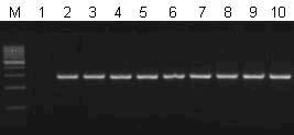 M.100bp DNA Ladder,1.陰性對照 2.紅樹林土壤,3.自然保護區(qū)森林土壤 4.玉米土壤, 5.水稻田土壤礦石區(qū)地表土壤(干) ,6.污水溝底泥,7.生活垃圾堆放地, 8.礦石區(qū)水底土壤(濕), 9.礦石區(qū)水底土壤(干) 10.陽性對照,大腸桿DH5a 基因組.