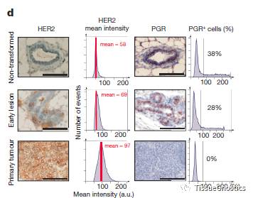 在HER2和PGR的定量分析中,利用奧地利TissueGnostics公司的TissueFAXS i-Plus倒置全景組織定量分析系統(tǒng)對(duì)組織進(jìn)行成像獲取,后利用HistoQuest軟件進(jìn)行定量分析。設(shè)定haematoxylin為master marker,HER2或者PGR為non-mastermarker. 單細(xì)胞的識(shí)別通過調(diào)節(jié)胞核大小,面積參數(shù),灰度值和背景參數(shù)確定。HER2和PGR的染色強(qiáng)度利用柱狀圖呈現(xiàn),實(shí)時(shí)正反向回溯隨時(shí)得到組織中相應(yīng)細(xì)胞信息。