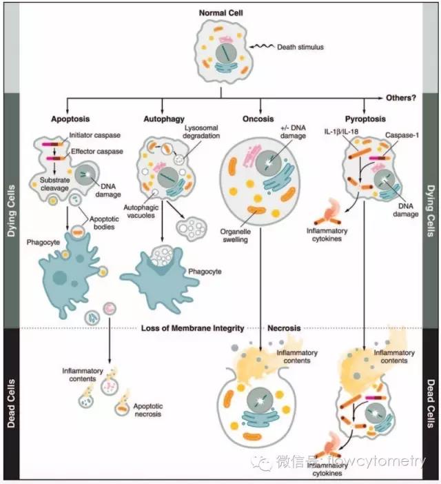2005年《Apoptosis, pyroptosis, and necrosis: mechanistic description of dead and dying eukaryotic cells》[1]這篇綜述將所有的細胞死亡形式都概括了一下,很直觀,那么我們同時結合這幅圖,將各種死亡形式的流式檢測手段都大致理一下,供各位做科研的朋友參考。