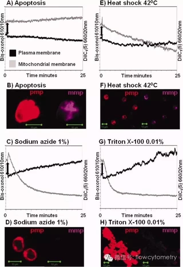 脹亡可能很多FLOWER都不太檢測,其實流式可以測,利用Annexin V FITC和DAPI排除掉凋亡細胞和壞死細胞,然后用DiIC1(5) 和 (DiBAC4(5))檢測線粒體膜電位和漿膜電位,實時觀察細胞在25分鐘內(nèi)發(fā)生的變化(如下圖),很清楚地看出疊氮鈉、Triton等引起的脹亡與凋亡、熱休克等不同之處,就是線粒體膜電位快速下降而漿膜電位輕微增高。簡單吧!