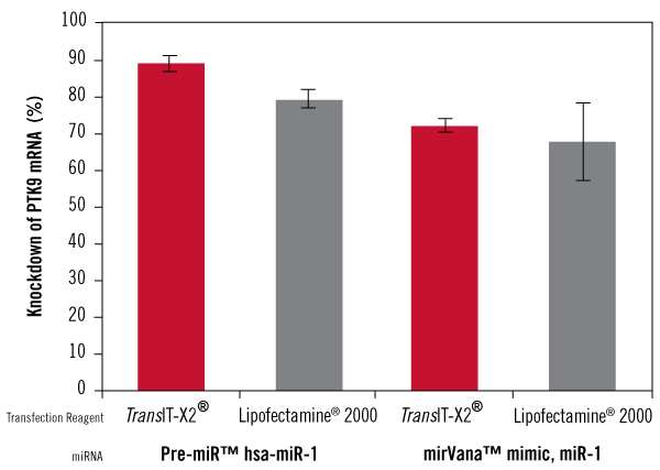 TransIT-X2® 動(dòng)態(tài)傳遞統(tǒng)比 Lipofectamine® 2000 具有更高的擊倒率。