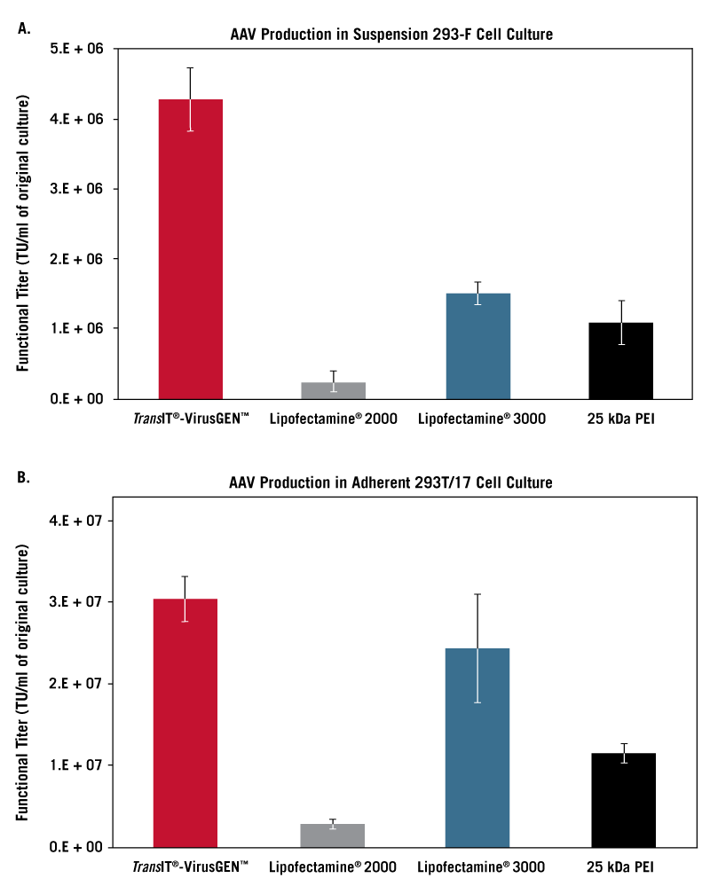 TransIT®-VirusGEN™ 在懸浮和粘附 AAV 細胞培養(yǎng)方面優(yōu)于競爭對手試劑