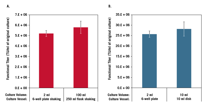 使用 TransIT®-VirusGEN™(2:1 試劑與 DNA 的比例(體積重量比),Mirus) ,使用指定的體積和培養(yǎng)容器,用 pAAV-hrGFP,pAAV-RC 和 pAAV-Helper(1:1:1 比例,1.5 總 μg/ ml,安捷倫科技)轉染在 FreeStyle™ F17 培養(yǎng)基 (A) 或粘附的 293T/17 細胞 (A) 中生長的懸浮 FreeStyle™ 293-F 細胞。將收獲的病毒用于轉導 HT1080 細胞,并通過流式細胞術測量 48 小時的 GFP 表達。從具有少于 20%GFP 陽性細胞的病毒稀釋液測量功能滴度。誤差條表示一式三份孔、燒瓶或培養(yǎng)皿的標準偏差。