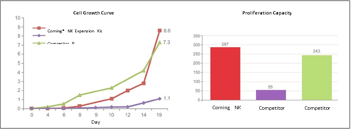 ?? The Corning® NK Expansion kit supports the rapid expansion of NK cells with high yields (~8.6 billion, 290-fold proliferation) and potent cytotoxicity activity (77.9% with an ET ratio of 5:1) which is very competitive compared with Competitors B and C.