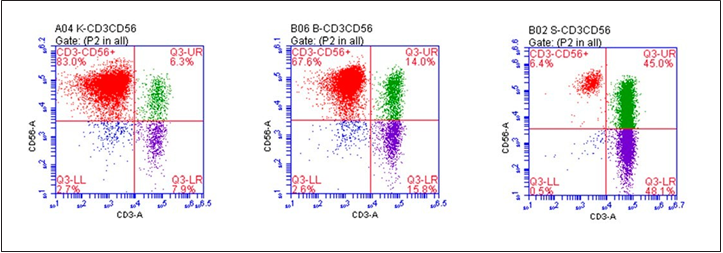 The CD3-CD56+ ratio is used to evaluate the surface marker expression level of the harvested cells. Briefly, 1 x 106 cells were added into 100 μL PBS and then stained with CD3 FITC antibody (BD Cat. No. 349201) and/or CD56 PE antibody (BD Cat. No.