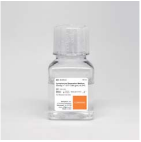 淋巴細(xì)胞分離液 (LSM) 可用于在體外從稀釋的全血中進(jìn)行淋巴細(xì)胞的分離。其分離原理為密度梯度離心,利用全血中不同細(xì)胞類型比重的差異通過離心完成細(xì)胞的分離 (圖1)??祵?nbsp; cellgro®淋巴分離液是一種無菌的等滲聚蔗糖和泛影酸鈉溶液,粘度低,在20℃下密度為1.077-1.080g/mL。